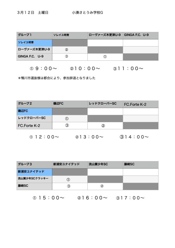 U9大会結果U10大会結果 U-9大会 予選組み合わせ *まん延防止延長に伴いまして、一部組み合わせ・時間等のご変更がございます。今一度、ご確認をよろしくお願いいたします。 U-10大会 1次予選組み合わせ *まん延防止延長に伴いまして、一部組み合わせ・時間等のご変更がございます。今一度、ご確認をよろしくお願いいたします。 *チームの諸事情によりチーム名称の変更がございます。 U-9決勝トーナメント 3月26日 1回戦 3月27日 準決勝・3位決定戦・決勝 U-10 2次リーグ 3月27日 2次予選 4月2日決勝T 1回戦 4月3日 準決勝・3位決定戦・決勝 U10 決勝トーナメント表